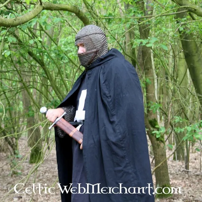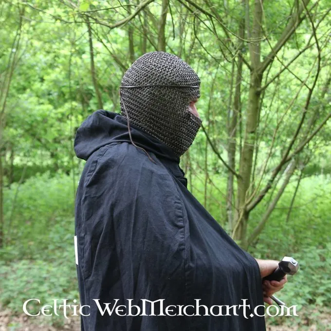 Ce courrier coiffe de chaîne est constitué d’anneaux épais en acier doux de 1,6 mm avec un diamètre interne de 8 mm. Il est tissé 4 en 1 à partir des anneaux noircis. La coiffe couvre les épaules et a une visière triangulaire qui protège le menton, la bouche et le nez. L’écran est recouvert de cuir à l’intérieur. Poids env. 3,3 kg.