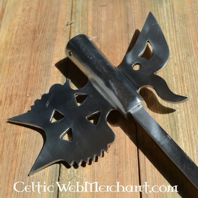 Cette réplique décoratif est fait d’acier d’épaisseur 3,5 mm. Le point est de 15 mm d’épaisseur. La longueur de la halberd est 56,5 cm et sa largeur est de 23 cm. Il est adapté pour un arbre avec une épaisseur d’env. 3,2 cm.