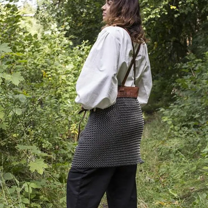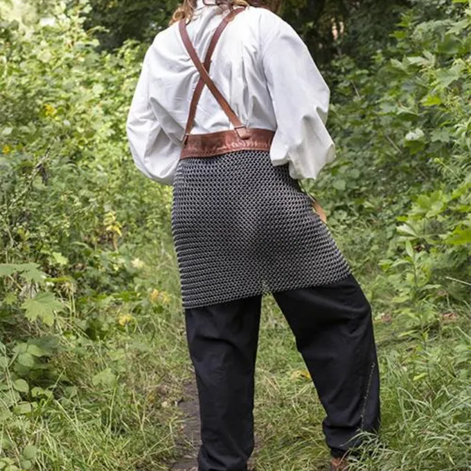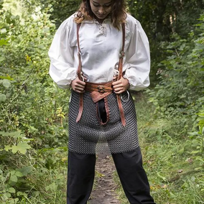 Cette jupe est idéal pour porter en dessous d’un cuirasses. La ceinture en cuir vous permet de le fixer autour de la taille. Deux bretelles en cuir rendent confortable à porter. La jupe de cotte de mailles est constitué d’anneaux de mildsteel aboutées dans un mélange 4: 1 de construction.