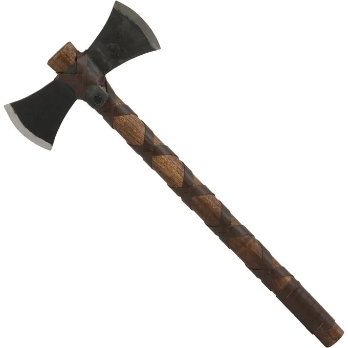 Cette hache Viking est basée sur des originaux et des répliques médiévales premières utilisées en série comme les Vikings et le dernier royaume. Au début de Moyen Age, axes étaient un outil essentiel dans la vie quotidienne. Ils ont été utilisés comme des armes, des outils pour couper du bois de chauffage, pour les réparations, etc. Chaque ménage nécessaire au moins une hache pour survivre. Cette hache a un fini forgé à la main et une tige en bois. L’arbre et la tête de hache sont décorées avec des sangles en cuir. Un accessoire idéal pour Viking ou pour la reconstitution des costumes vikings.
