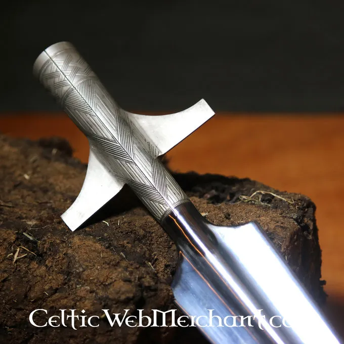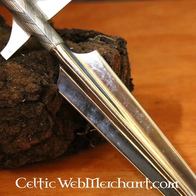 Ce fer de lance décoré est une réplique d’un original du 10ème siècle. A l’origine, ce type de fer de lance a été utilisé du 8ème au 11ème siècle. Ils étaient parfois décorés (gravés ou peints). Les fers de lance de ce genre ont été utilisés par les Vikings, les Carolingiens, les Mérovingiens et les Anglo-Saxons.