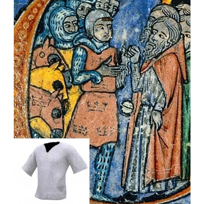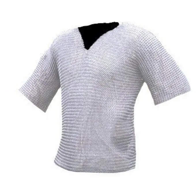 Ce haubert est faite de 1,6 mm d’épaisseur anneaux ronds butée zingué avec un diamètre intérieur de 9 mm. Les anneaux sont tissés à la main quatre en un. Le haubert a manches courtes et atteint à la hanche.