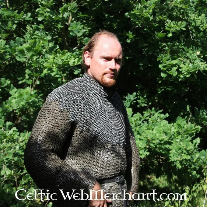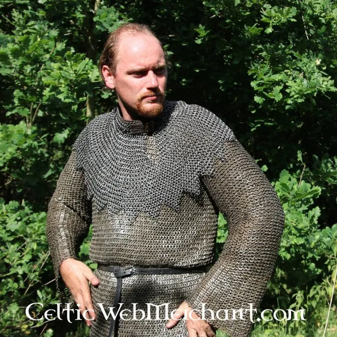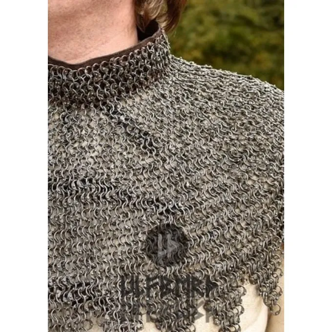 Aventails comme celui-ci ont été portés toute l’Europe au cours du 15ème et 16ème siècle. Au 16ème siècle, il était immensément populaire parmi les Landsknecht allemand et l’Galloglass écossais et irlandais. Ce type de camail est aussi appelé Mantle Bishop. Il a des lanières de cuir avec réplique boucles. La face inférieure de la collerette est fabriquée en laiton chainmail. Cette camail est faite de ronds anneaux rivetés, rivets ronds 1: 4.